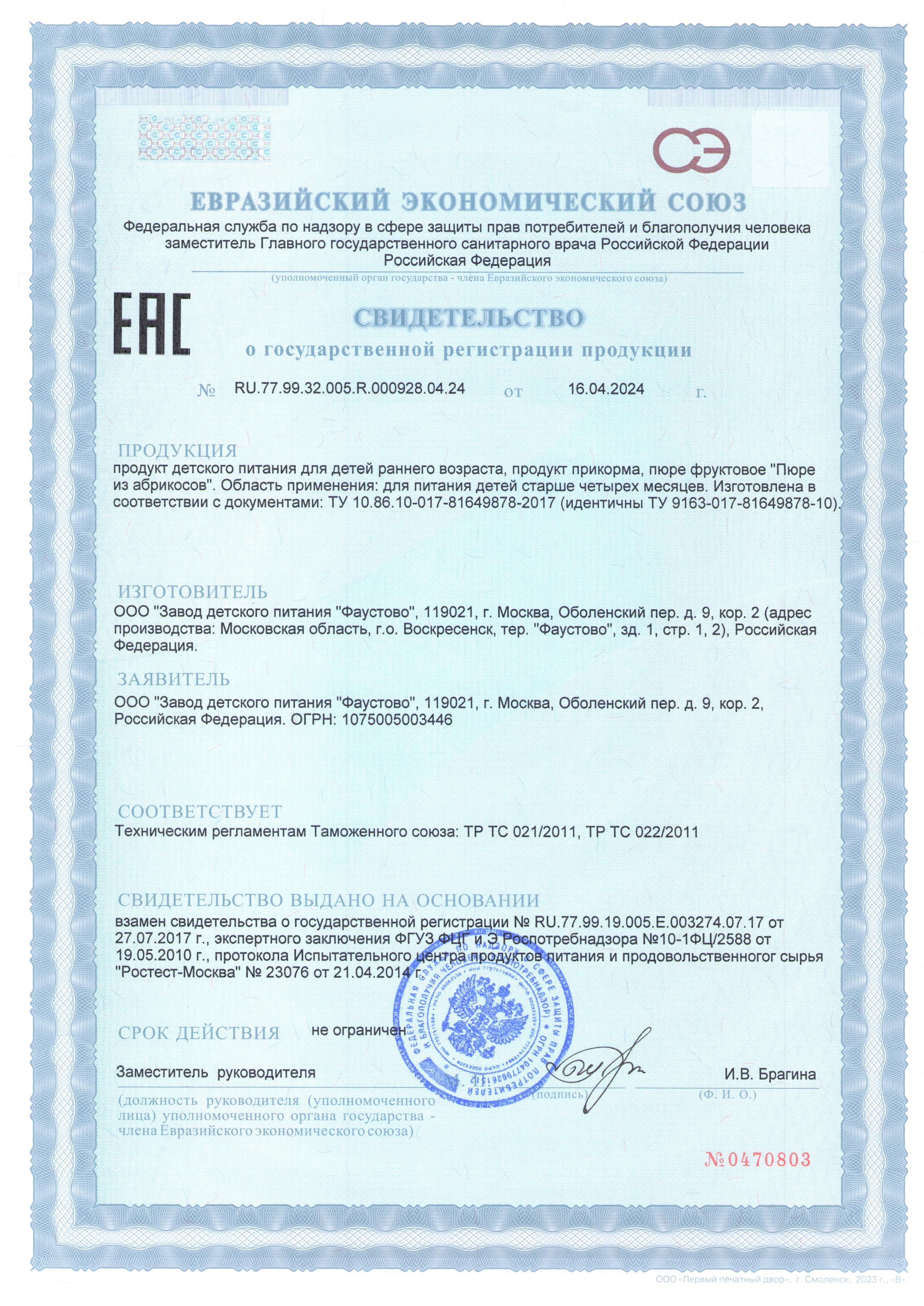 Пюре фруктовое гомогенизированное стерилизованное для питания детей раннего возраста