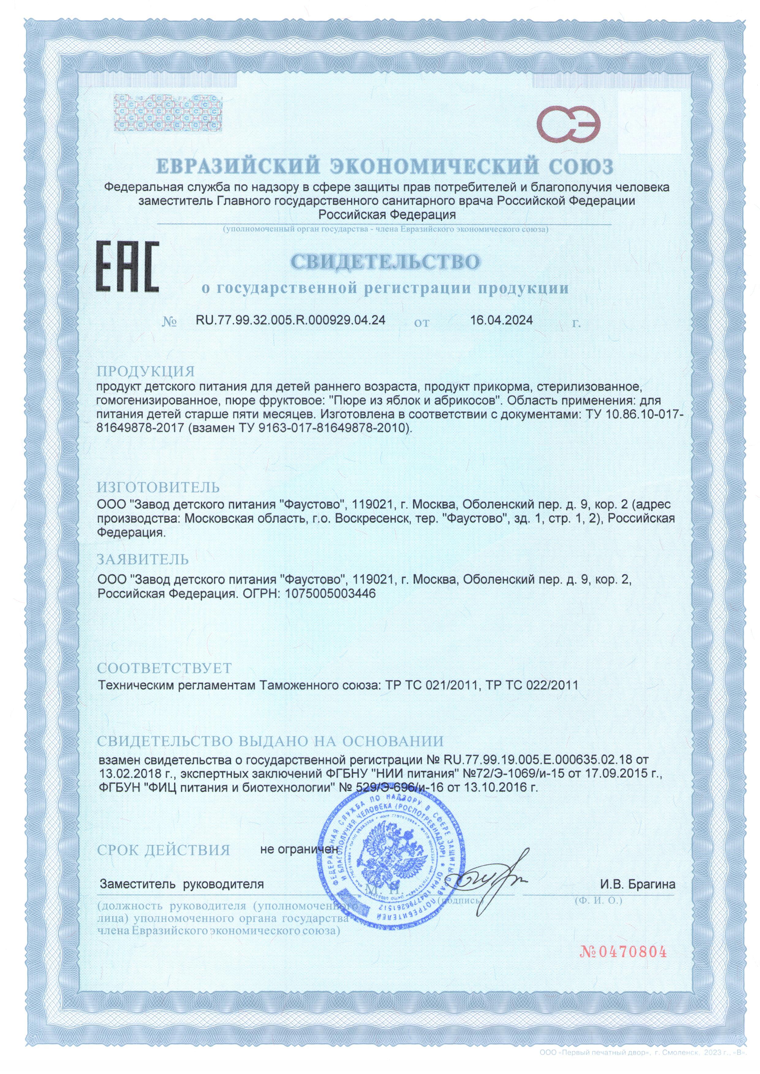 Пюре фруктовое гомогенизированное стерилизованное для питания детей раннего возраста