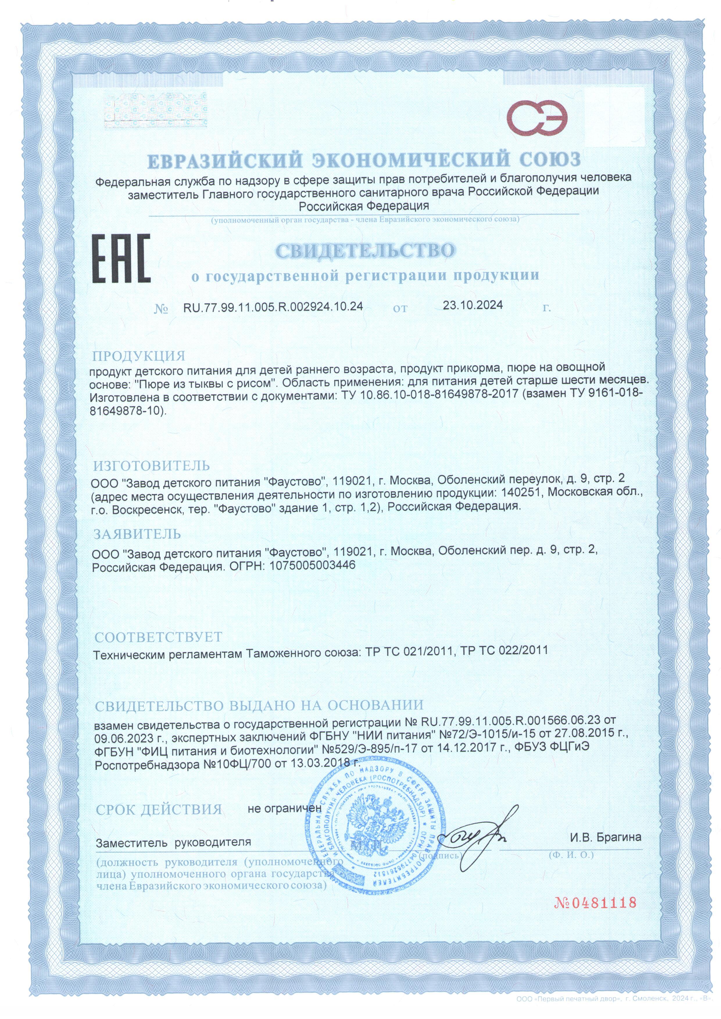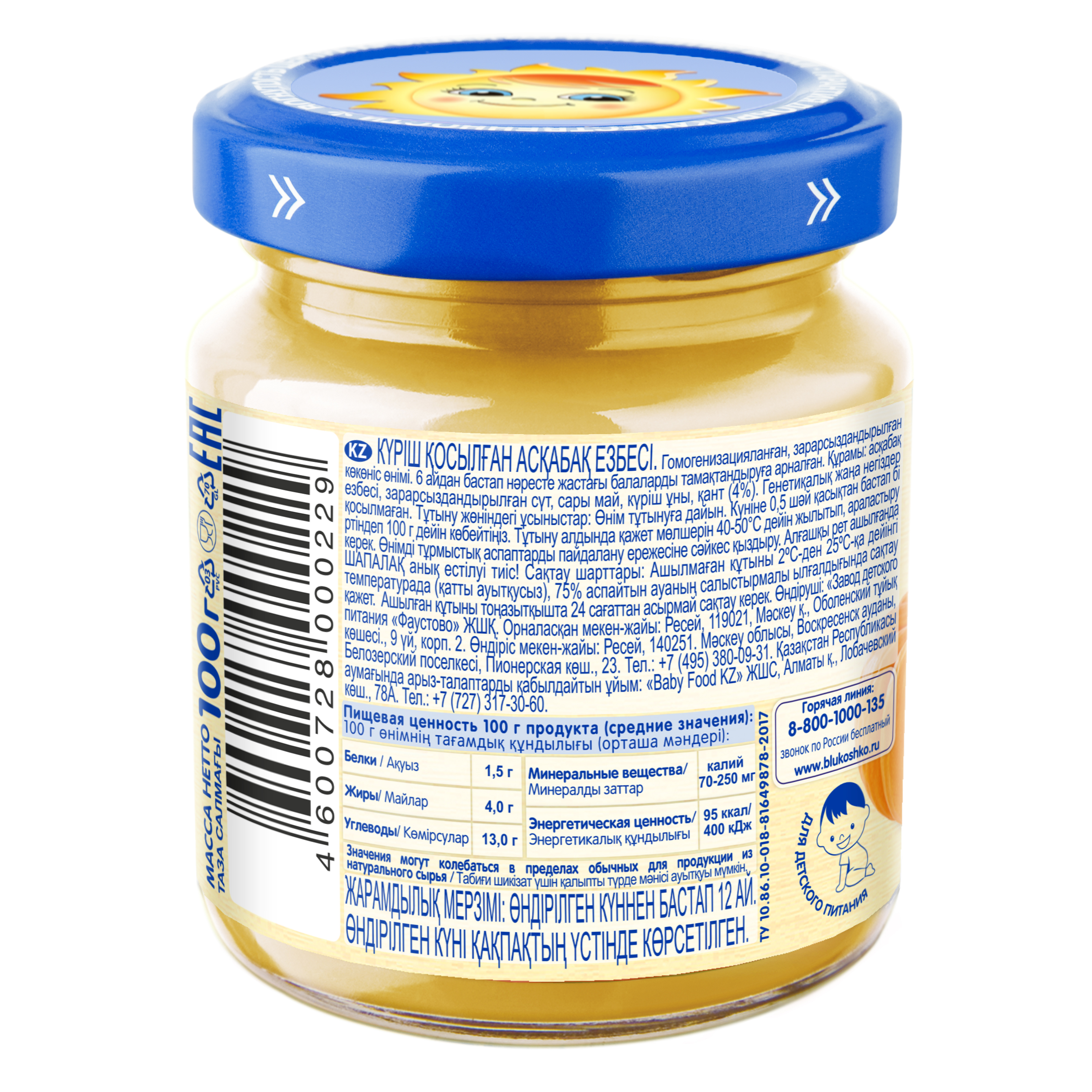 Состав: Пюре из тыквы, молоко пастеризованное, масло сливочное, мука рисовая, сахар.