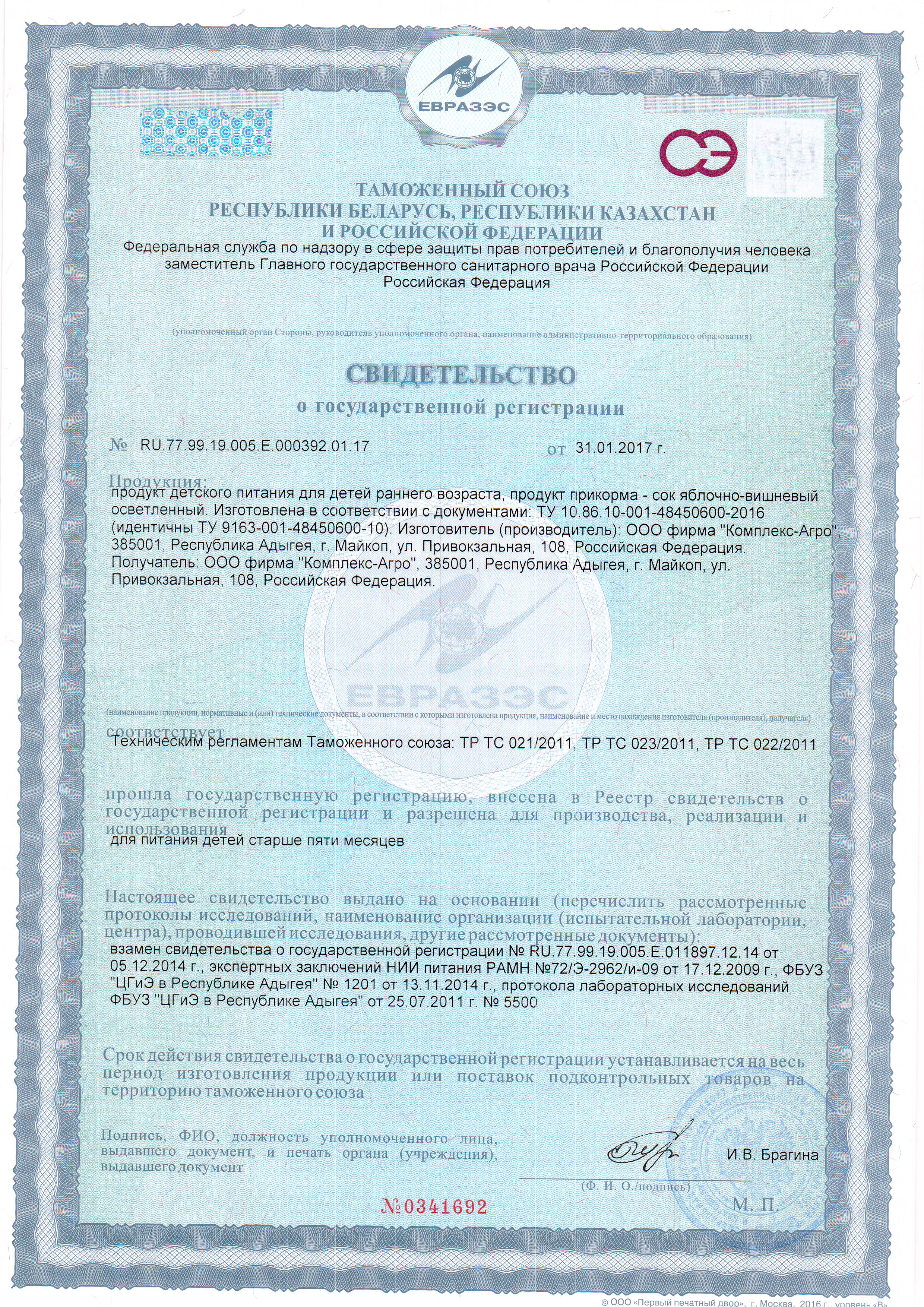 Сок поликомпонентный осветлённый восстановленный для питания детей раннего возраста